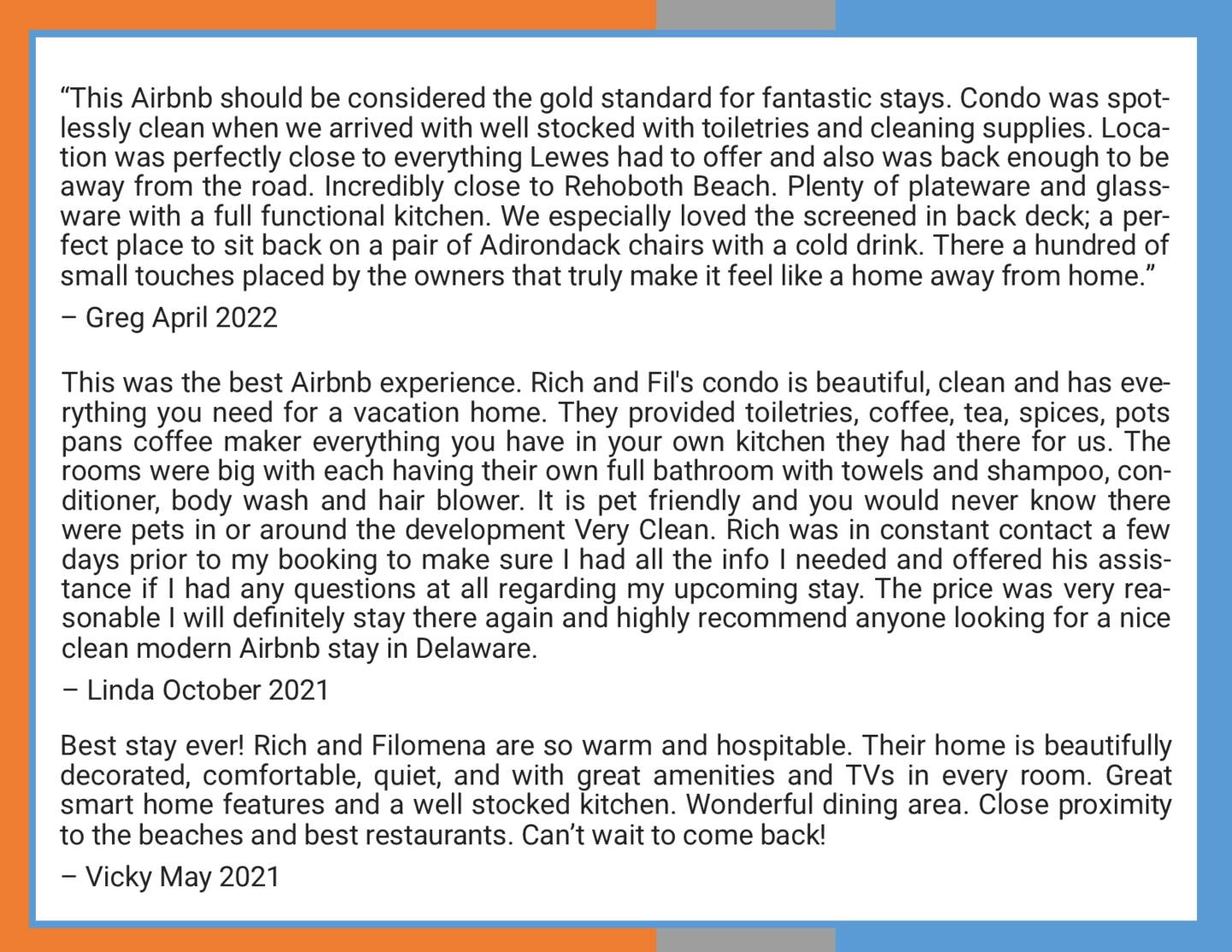 August-10 2023Rich and Fil's home was clean and homey, well stocked with everything we needed for a comfortable stay. They provided amenities such as shower gel, shampoo and conditioner, laundry and dishwasher pods. We cooked several meals during our stay and also enjoyed our time at the Rehoboth Beach boardwalk just a short drive away. The beds were clean and comfortable, allowing us a restful night's sleep. The condo sits at the back of the building, giving us quiet and privacy with a screened in porch. The pool was a plus, a nice way to spend late afternoons relaxing before dinner. The location of the condo is great, and they even provided a book with information and recommendations in the area. We accidentally left a couple of personal items, and they were very responsive and kind to mail them back to us - thank you! Rich and Fil have put a lot of thought and care into making their home a welcoming place! -- Regards, Jeane K.